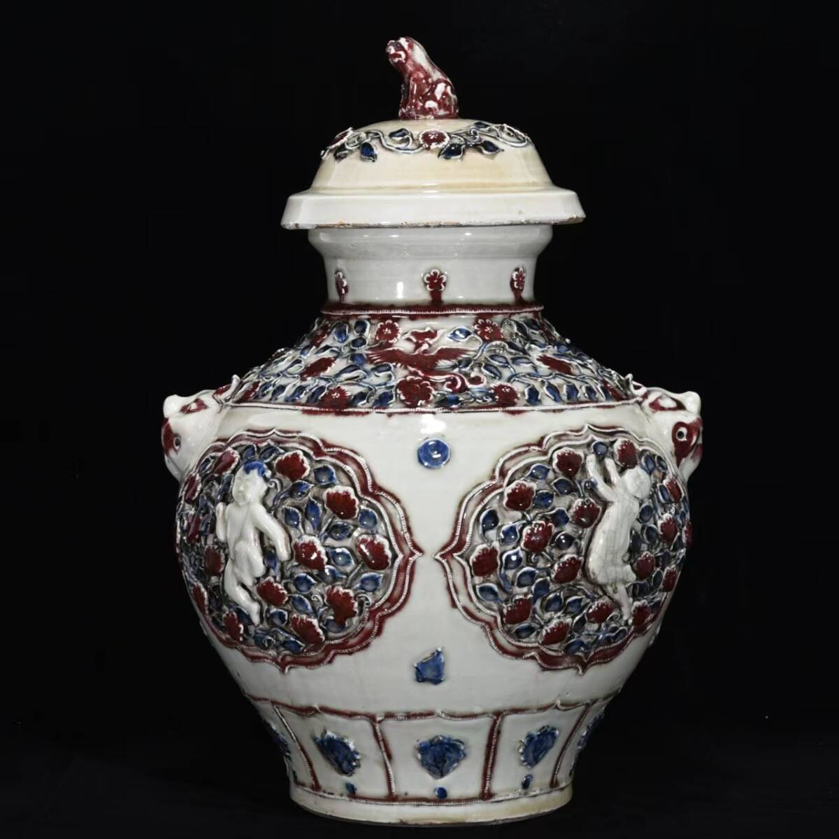 > 磁器 元時代 青花釉里紅捏花貔貅獣頭蓋罐・缸 秘蔵 47cm古陶磁器 陶芸 唐物 古賞物 時代物 骨董品 古置物 極細工 中国磁器 古美味 古玩921