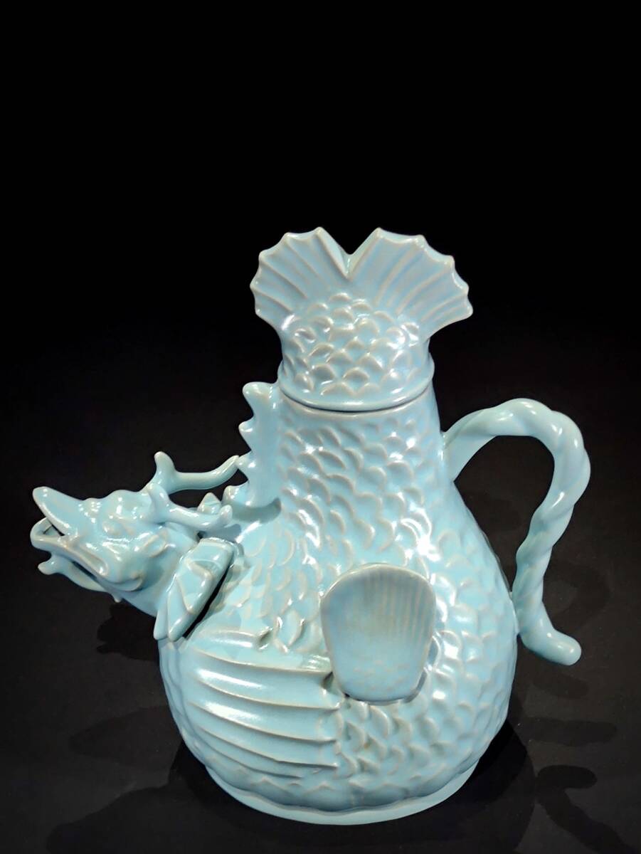 > 9_ZZ9291【惠】人間国宝 中国骨董 陶芸 磁器【汝窯天青魚化竜徳利,奉華款です】工芸品 施釉陶 青花磁 陶芸 置物 收藏品