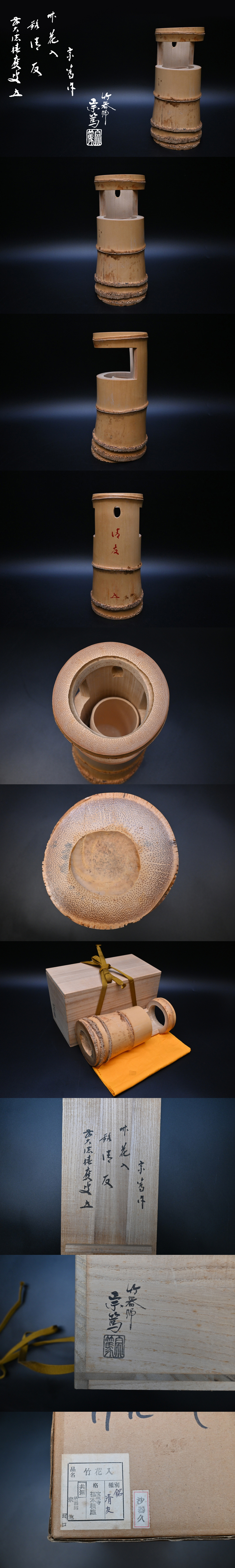 > 竹器師 影林宗篤 竹花入れ■大徳寺派 宝林寺 福本積應 花押 書付[銘 清友] 一重切花入■茶道具 華道具 生け花 茶道具 華道具 木箱外紙箱■