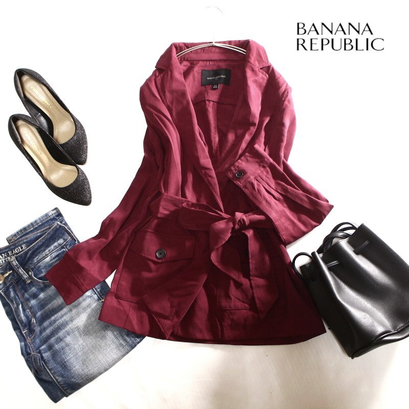 - 美品 バナナリパブリック Banana Republic 合物 ダークカラー ベルト付き ジャケット 羽織 XS ダークレッド 赤 秋 冬