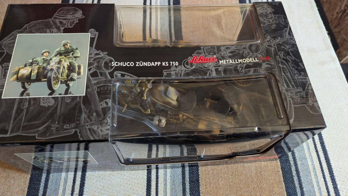 > Schuco シュコー ZUNDAPP KS 750 MIT BEIWAGEN METALLMODELL 1:10 ツェンダップ サイドカー&フィギュアセット 未使用 コレクション品
