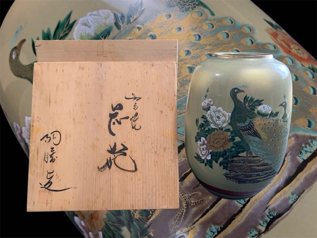 - ★九谷焼★花瓶 花器 花入 花生 孔雀 ボタン 共箱 高さ約24cm 現状品★718-13/flok★et2115
