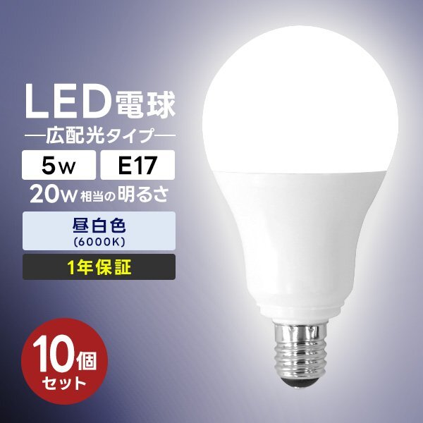 - 【10個セット】LED電球 5W 口金E17 明るさ20W相当 昼白色 工事不要 替えるだけ 省エネ 高寿命 節電 ライト ランプ トイレ 風呂場 照明器具