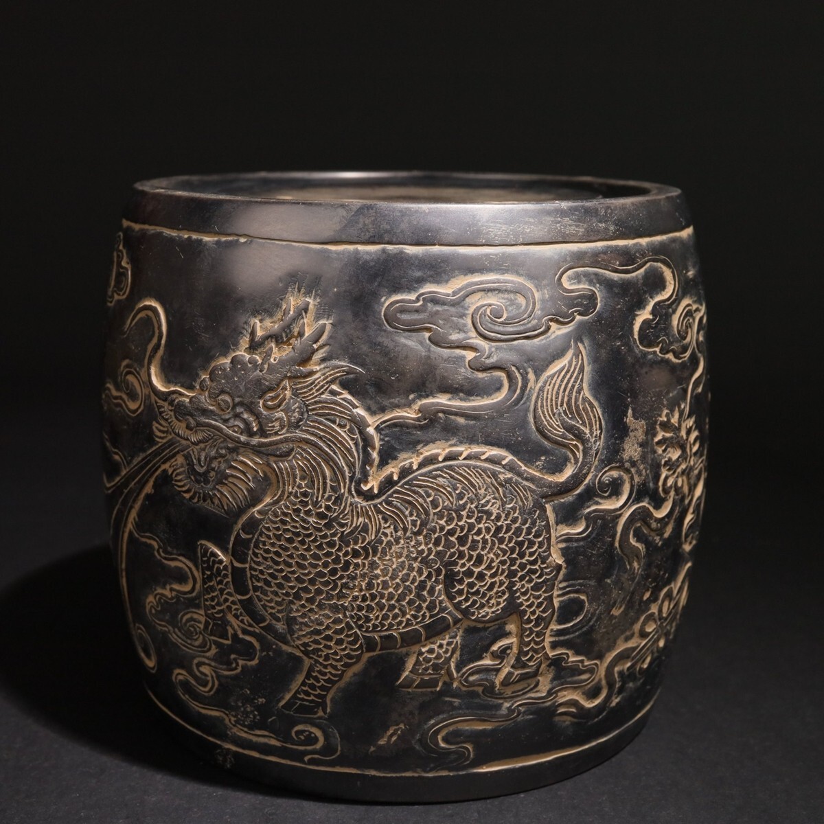 - 「古端石硯 麒麟献瑞 鼓形文房端渓硯 徐殿飆銘 清時代」手彫り 文房四宝 書道具 中国古美術 旧蔵出