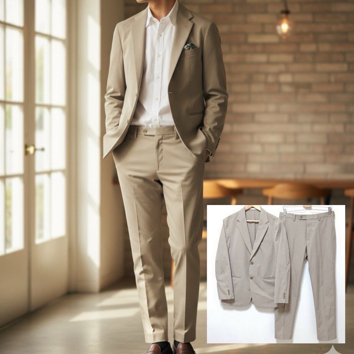 - 軽量 ドライ ストレッチ◎【UNIQLO】ユニクロ セットアップ 感動ジャケット パンツ 上下 スーツ 速乾 伸縮 ビジネス ベージュ L /Y36328ji