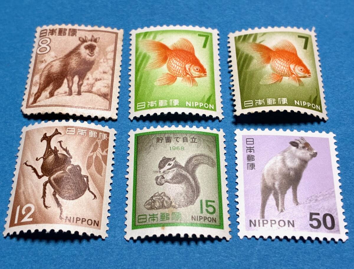 - カモシカ8円・金魚7円2種・カブトムシ12円・貯蓄増強宣伝15円・ニホンカモシカ50円【未使用】第一次動植物国宝図案ほか