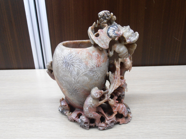 大理石彫刻 花器 中国美術工芸品 置物 花瓶 石彫刻 横幅12.3㎝×高さ15.5㎝ オブジェ 動物の彫刻 現状品 苫小牧西店
