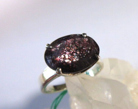表面にレインボーのキラキラが出ているアイオライト・サンストーンです。一見透明感がないようですが、光りを当てますと、ミルキーな透明感で、ブルーの石の中に赤茶色の粒粒が入っているのがわかります。非加熱。