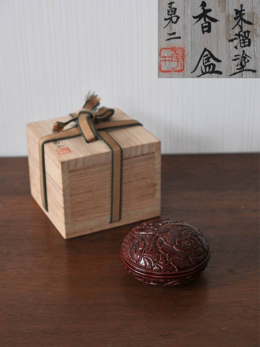 - 【青枠】勇二 牡丹文 堆朱 香合 細密細工 香道具 茶道具 箱付 古道具 時代物 美術品Q1940