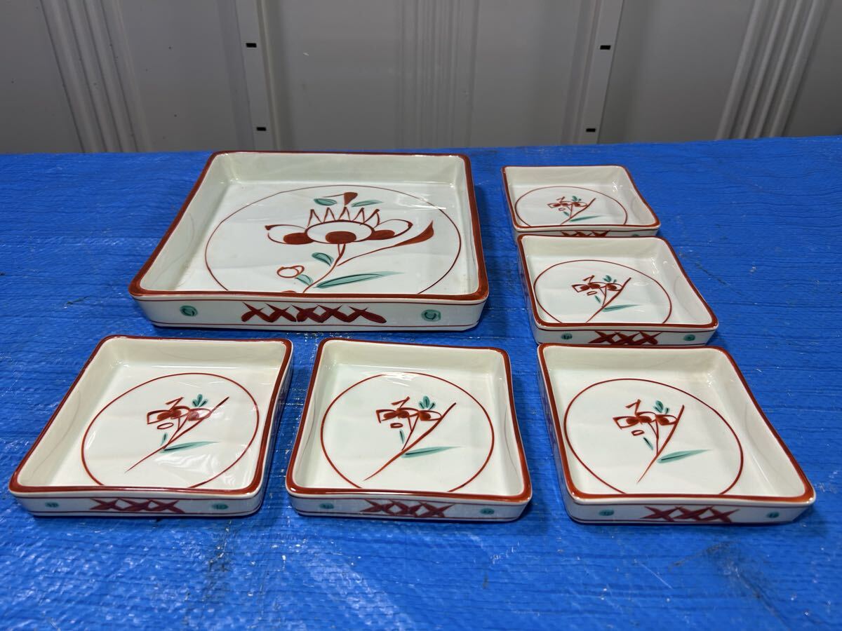 - 【書道先生放出品 希少価値品 】橘吉 昔 漢字 赤絵菊 角皿 6枚セット 大皿×1枚 小皿×5枚 和食器 有田焼 陶器 盛皿 食器 皿