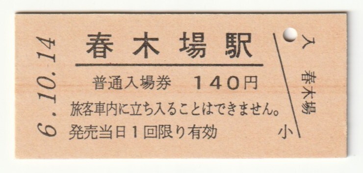 - 平成6年10月14日 田沢湖線 春木場駅 140円硬券普通入場券(日付印刷)