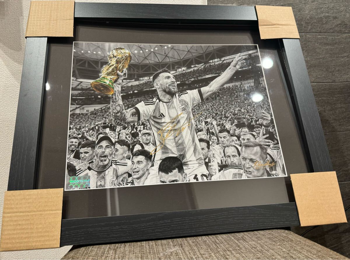 - Lionel Messi Signed Tribute Artwork In Black Wooden Frame: 2022 FIFA World Cup Winner リオネルメッシ 直筆サインアートワーク auto