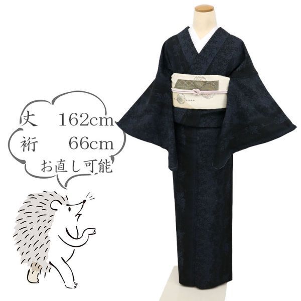 > 【お召】 単衣 『塩沢絣』 雪塩沢 植物唐草片寄せライン 濃紺 正絹着物 TA5-6