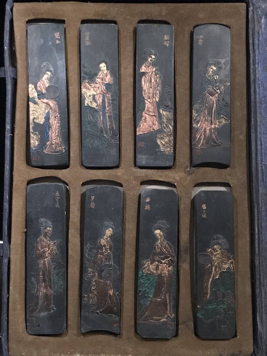 - 清時代 古徽州墨 仕女図墨 詩文 書道具 文房具 彩絵 書画用墨 文人雅士墨 可使用 極細工 古美味 東洋彫刻 時代物 骨董 中国古美術