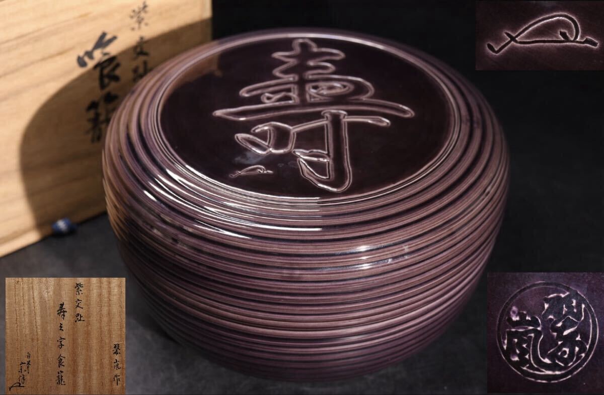 - 中村翠嵐 作 永田宗伴 自筆 「 紫交趾 寿の字 食籠 」 識箱 / 交趾焼 茶器 煎茶道具 表千家 .G2626