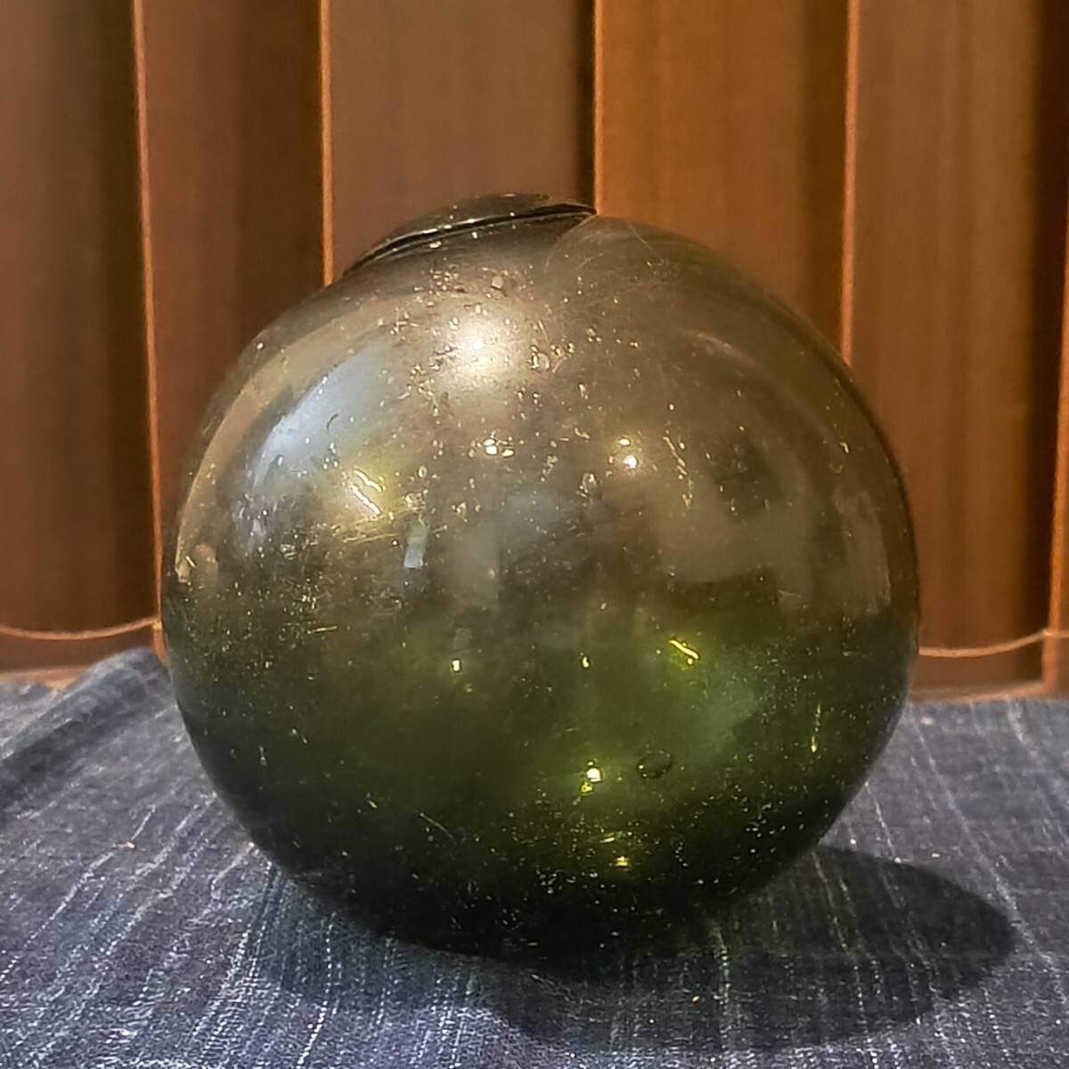 - 珍品!! ガラス 浮き玉 浮き球 濃緑色 丸に「シ」 検) 骨董 古道具 古民具 漁具 時代物 ビンテージ でべそ 気泡 ゆらゆら