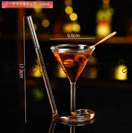 > 【個性派ガラスカップ】バー用吊り下げ型ドリンクカップ 不規則形×耐熱透明ガラス 吸管付きカクテルグラス 110ml【マティーニ風】