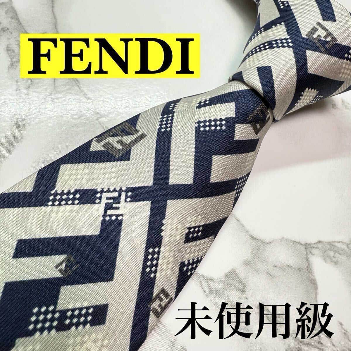 - 未使用級 現行タグ 激レア FENDI ネクタイ シルク100% ズッカ柄 デカロゴ FF ナロータイ プリント ネイビー 送料無料