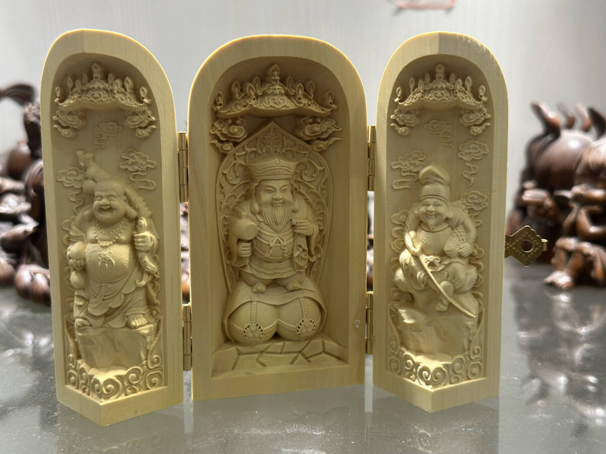- 新品未使用 仏像 三開仏 開運招福七福神 【布袋様 大黒天 恵比寿】 木彫り ミニ 仏壇 仏箱 仏龕 置物