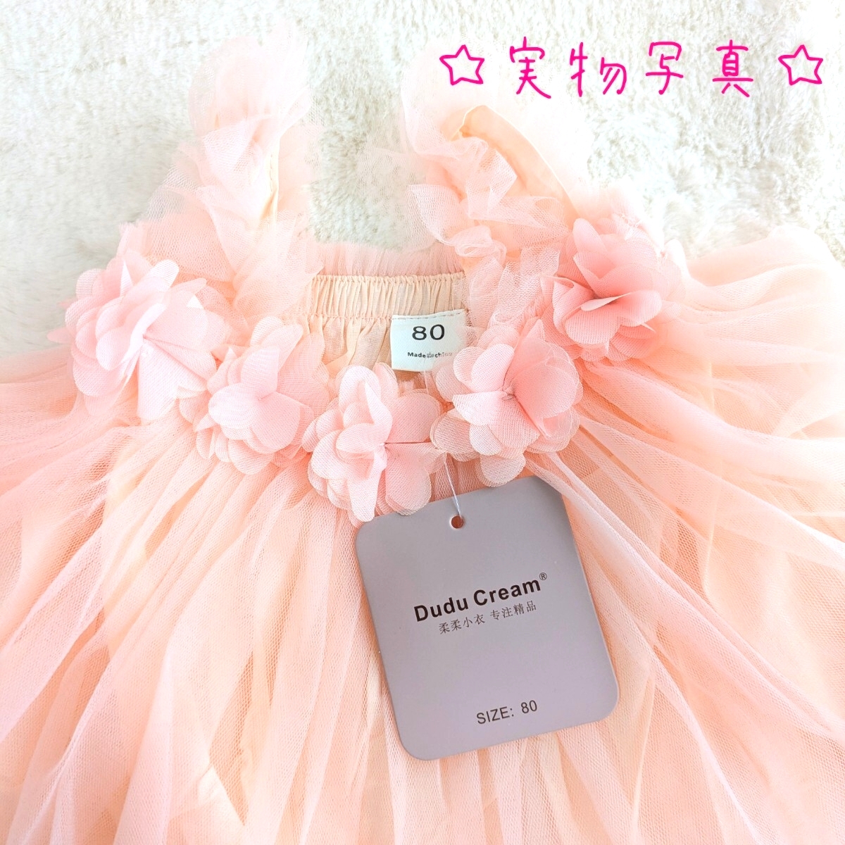 > ピンク80cm ベビードレス チュール くすみカラー チュチュワンピース ドレス ハーフバースデー1歳 フラワーモチーフ