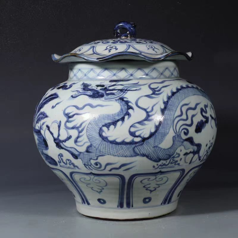 - 元時代 古陶磁器 麒麟龍紋 青花 荷葉罐 罐 文案置物 磁器 陶芸 擺件 時代物 古董品 骨董 旧家蔵出し 唐物 中国古玩 古美術品