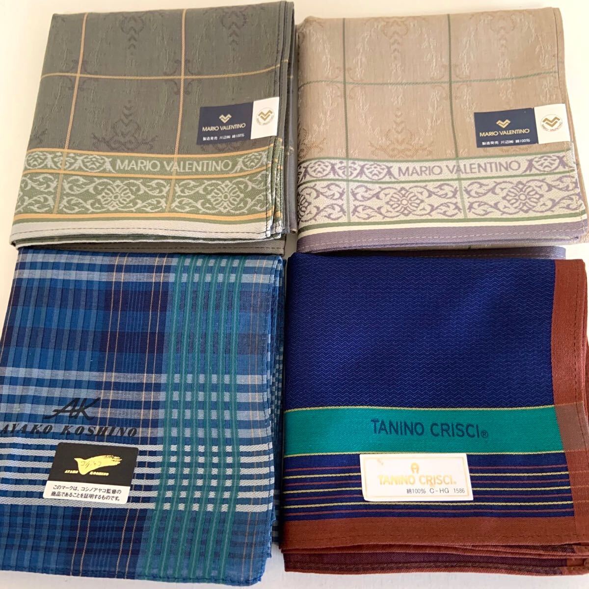 > 未使用 MARIO VALENTINO TANINO CRISCI タニノクリスチー AYAKO KOSHINO コシノアヤコ 大判 ハンカチ 4枚 綿100% メンズ 紳士 まとめ売り
