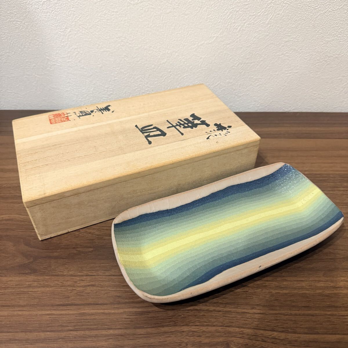 - *fufu* 宮下善爾 彩泥筆皿 四方皿 23cm 共箱 食器 和食器 陶器 グラデーション 青 ao