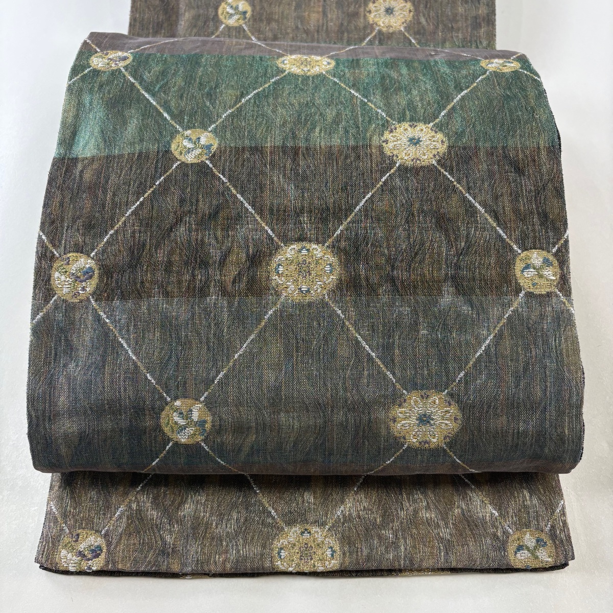 > 袋帯 美品 秀品 横段 華文 金糸 箔 茶緑色 六通 正絹 【中古】
