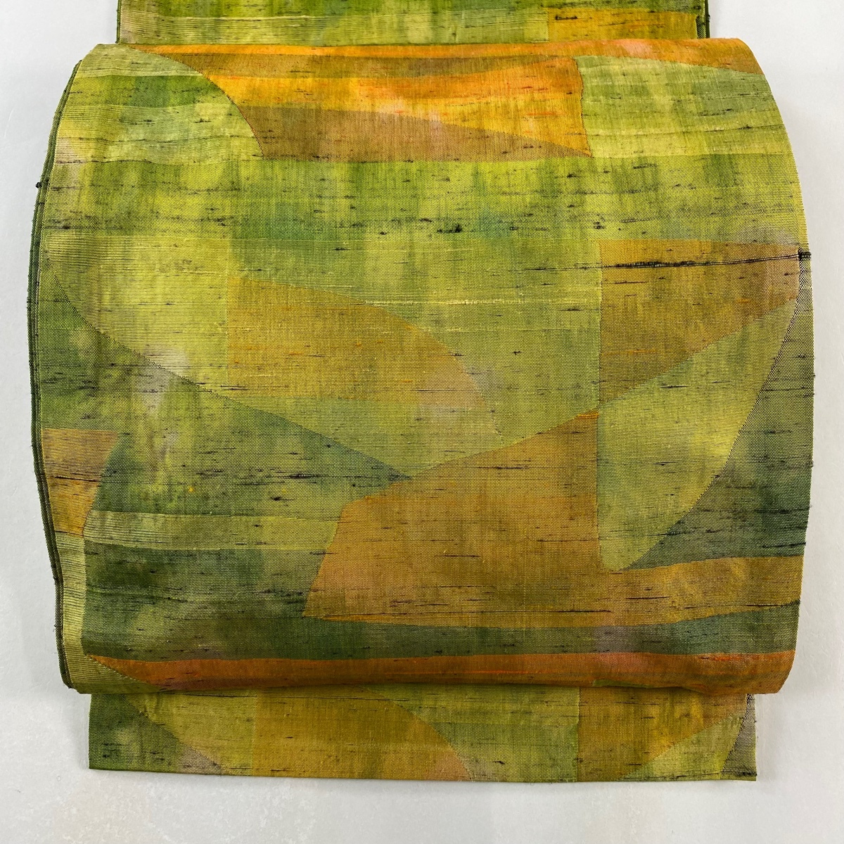 - 袋名古屋帯 美品 優品 紬地 幾何学模様 黄緑色 正絹 【中古】