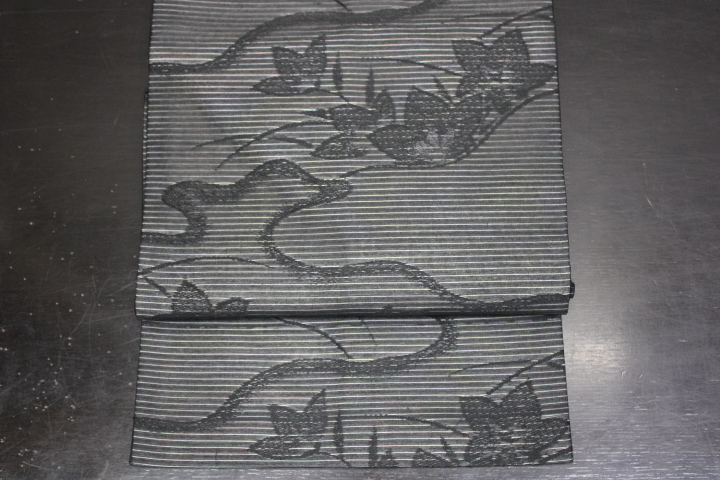 - きもの今昔8992 黒の礼装 夏用絽の喪名古屋帯 西陣織正絹7本絽 水の流れに桔梗の柄 未使用品
