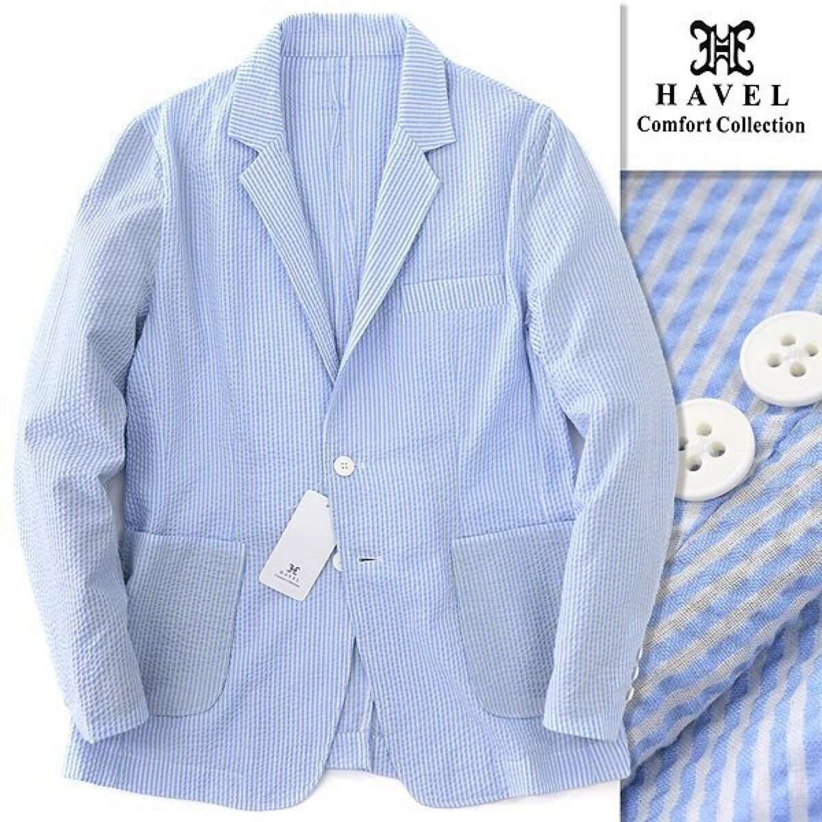 - 新品 HAVEL ハヴェル 吸水速乾 シアサッカー ジャケット 青 白 春夏 メンズ 洗える 盛夏 サマー アンコン ブレザー サックス Mサイズ