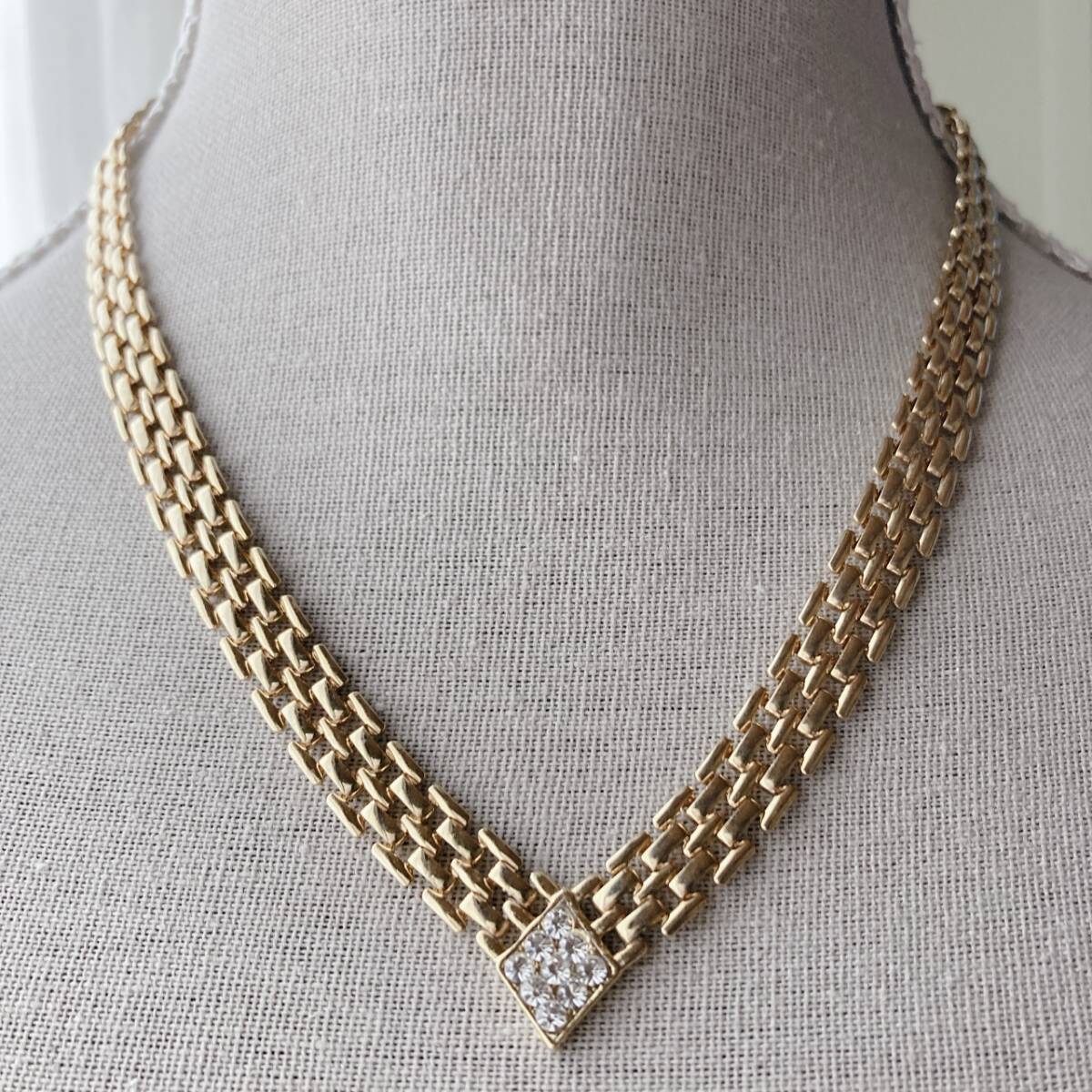 > ネックレス ゴールドトーン V字型 ソフトウォッチチェーン ラインストーン ゴールド美品☆vintage jewelry accessories F0196