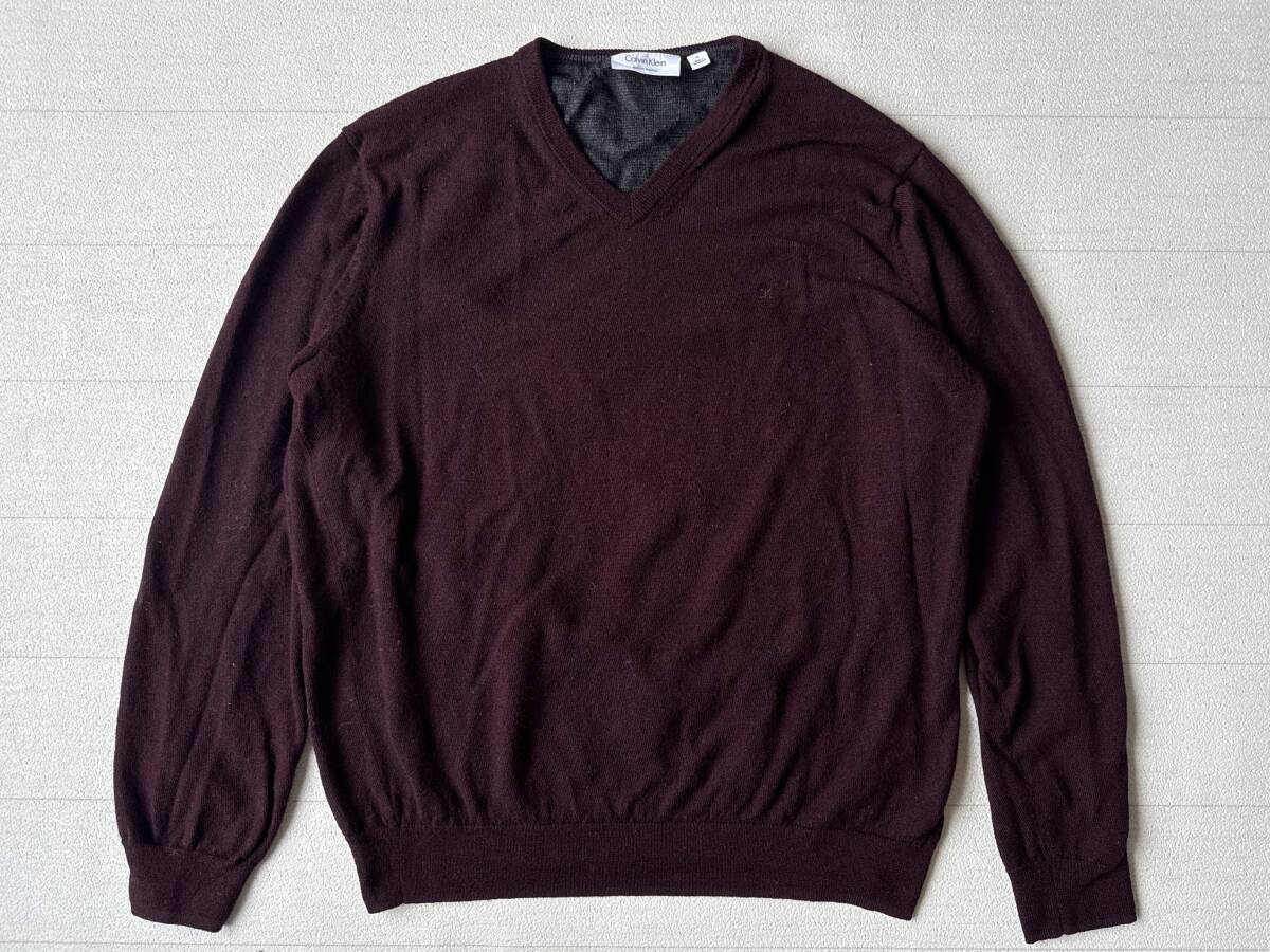 > ☆送料無料☆ Calvin Klein カルバンクライン 古着 Vネック イタリアン メリノウール ニット セーター メンズ XL ボルドー系 トップス 中古