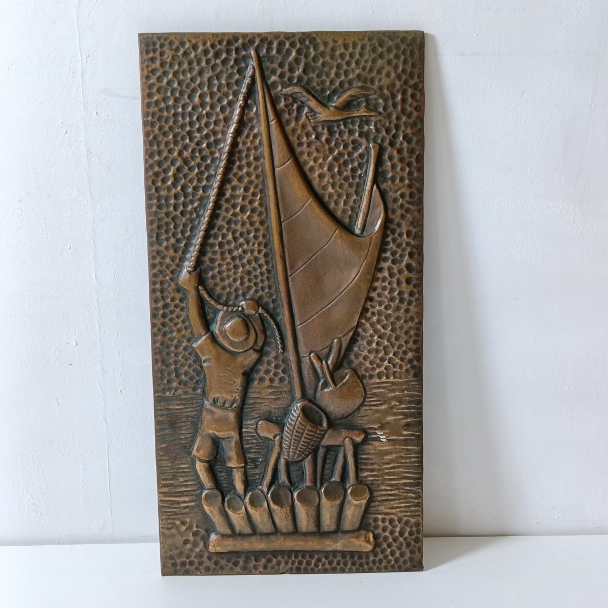 - 南米 ブラジル製 COBRARTE 銅板画 銅細工 壁掛けアート アマゾン河の漁師 35.5cm×17.7cm 390g [ディスプレイ インテリア ビンテージ]