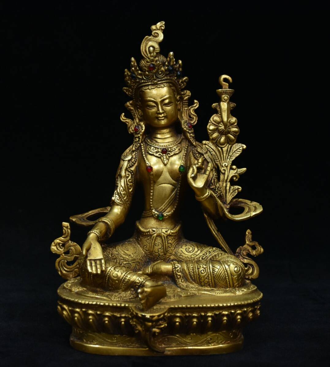 - 蔵友旧蔵出 銅製 塗金 寶石嵌 綠度母菩薩像 供奉仏像 希少珍品 貴重品 置物 古賞物 密宗密教 供養品 仏教美術品