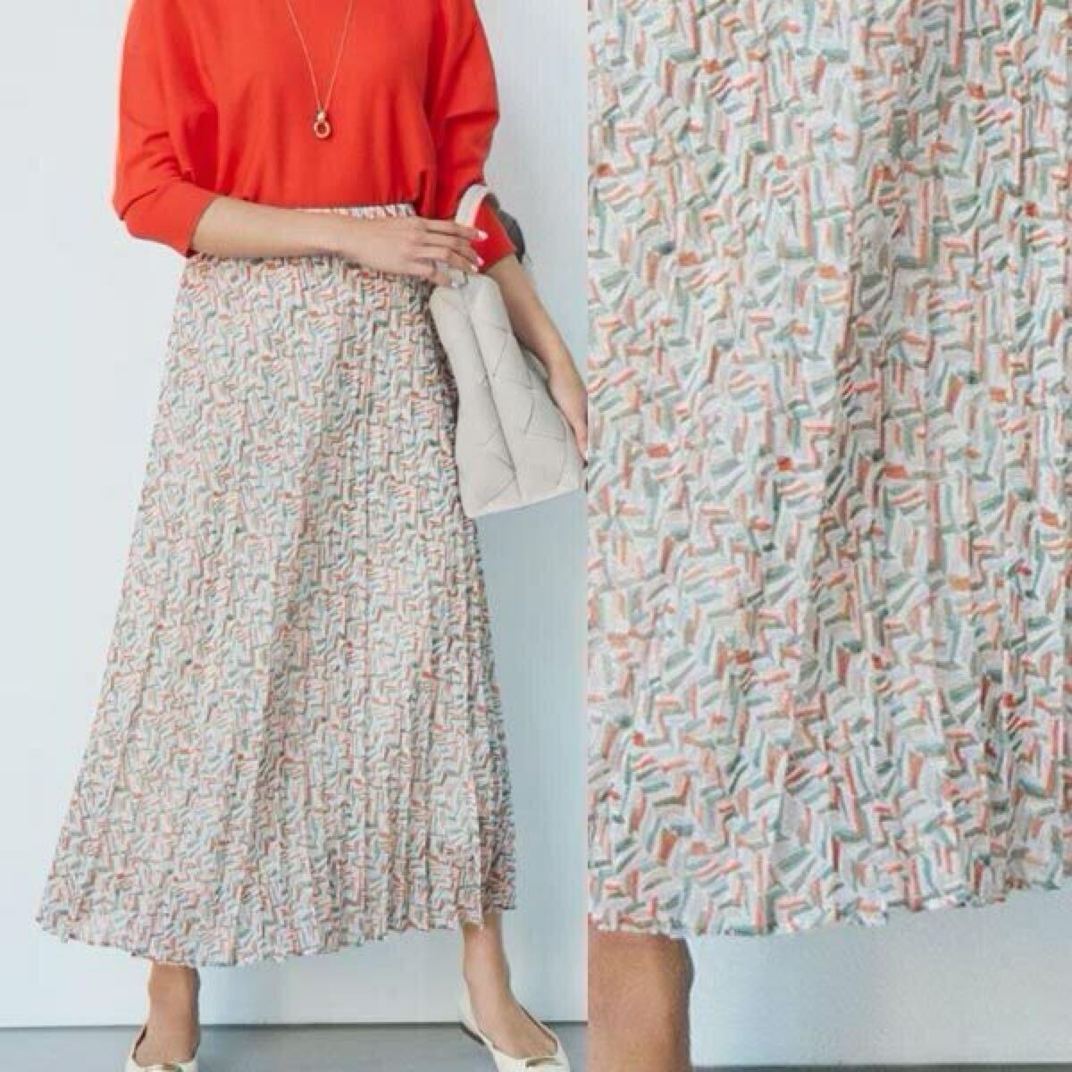 - 23区【洗える】シアーヘリンボーンプリント プリーツ スカート 40・オレンジ系Lサイズ・新品