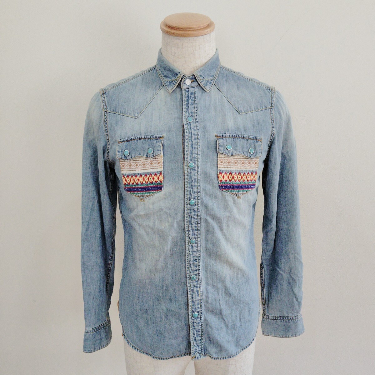 - 198/M/TK MIXPICE メンズ シャツ 長袖 刺繍 綿100 青