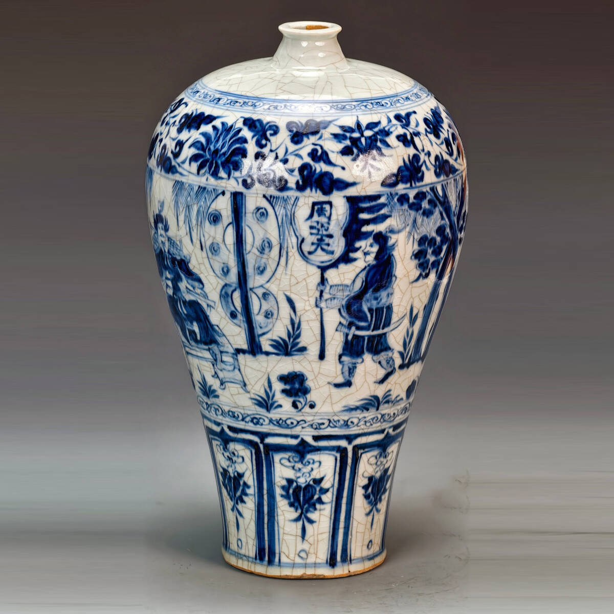 - 9+GV9730「東洋美術」 中国骨董 人間国宝 磁器製品【青と白の全面絵梅花瓶】 旧物 孤品 珍品 陶磁器 収蔵価値が高い