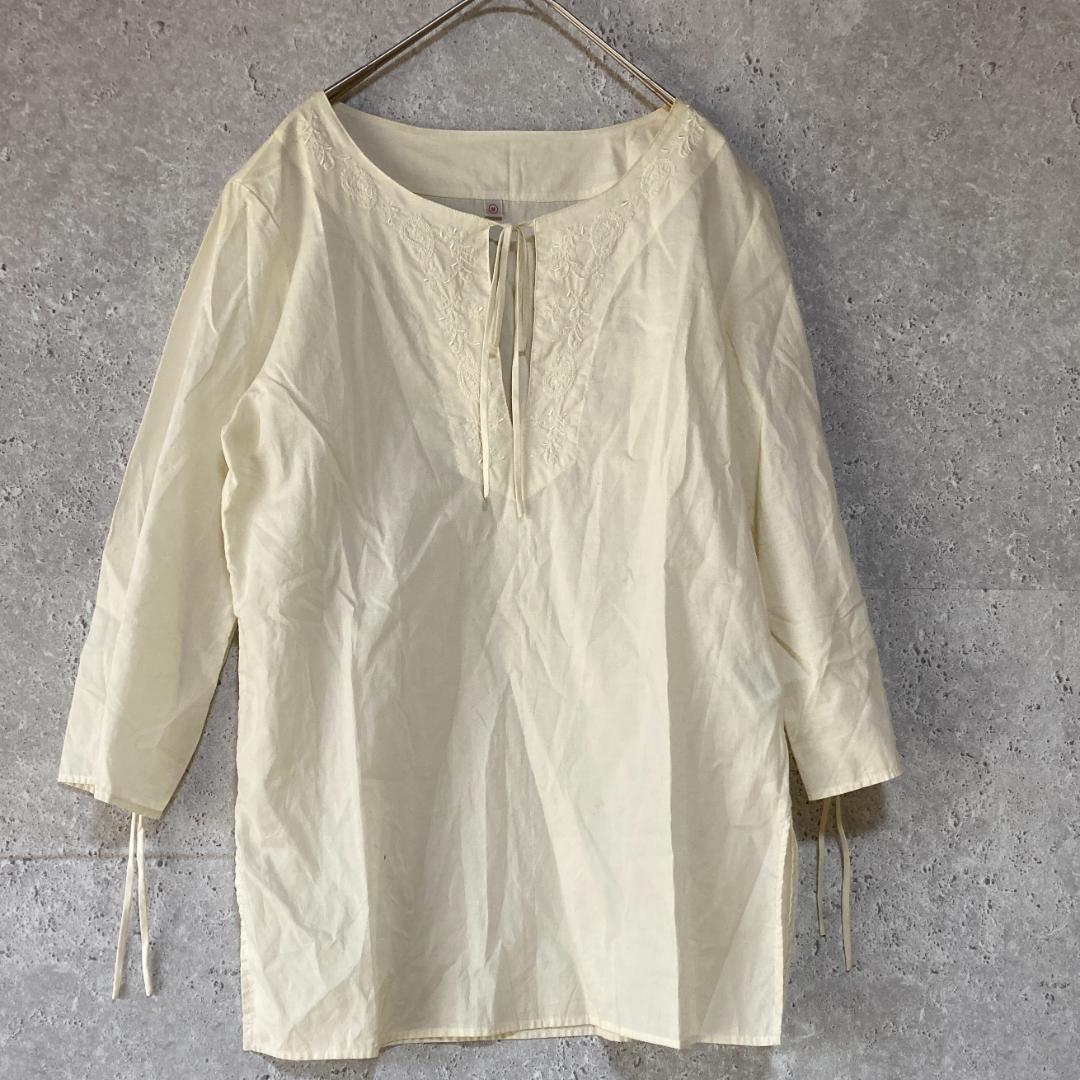 - ユニクロ(M)七分袖ブラウス*エンブロイダリー刺繍*袖ギャザー*前リボン*涼しい