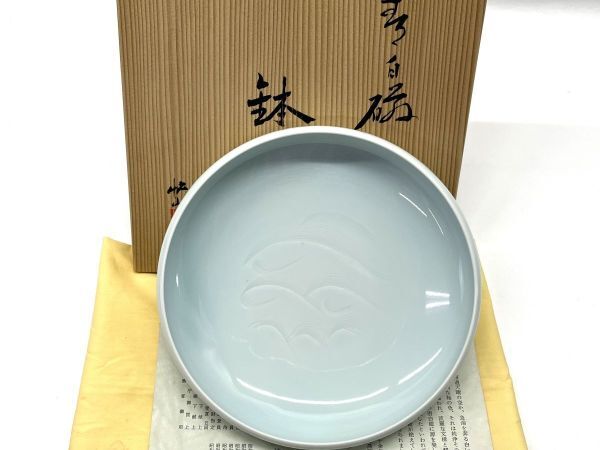 - 【K566】未使用 快山窯 青白磁 鉢 直径22.5cm 木箱 人間国宝 塚本快示 陶器製 焼物 木箱 落款 b