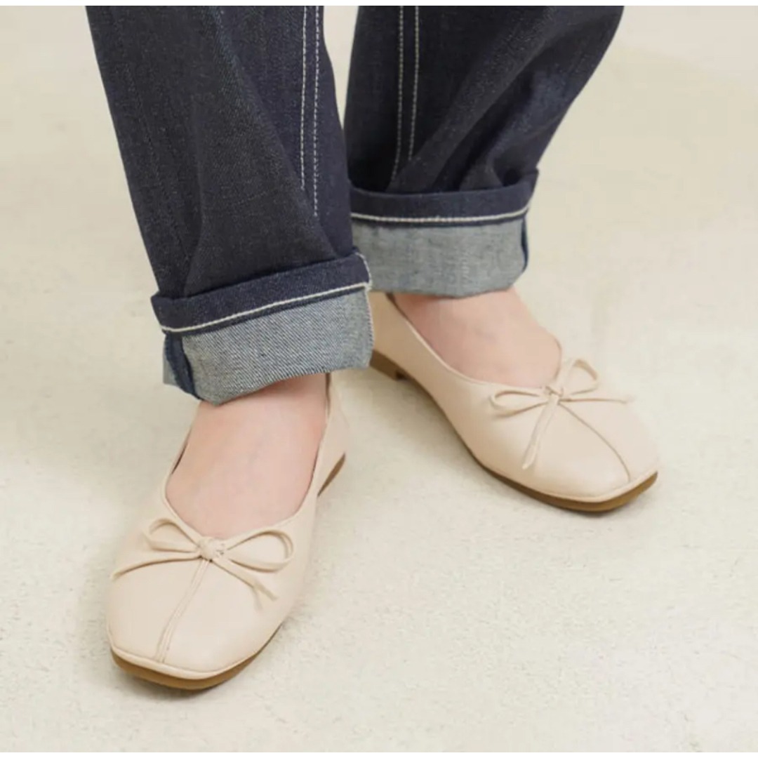 - 新品 リボンバレエパンプス ベージュ 23cm 韓国風 オルチャン 高級 スリッパ スクエアトゥ クッションインソール フリルゴム レディース 靴