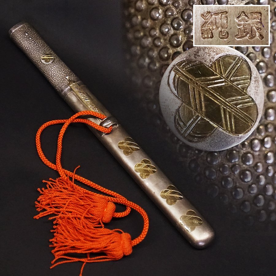> 純銀製 純銀 刻印 短刀 日本刀 工芸品 家紋 違い鷹羽家紋 守り刀 縁起物 時代 骨董 重量294g 金属工芸 古美術品