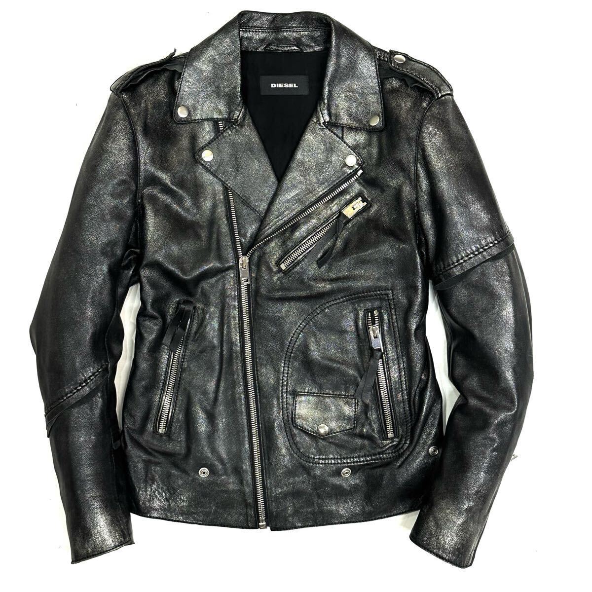 - 美品!!DIESEL ディーゼル シルバーコーティング 羊革 ラムレザー ダブル Dポケット ライダース ジャケット(S)ブラック 黒 メンズ ブルゾン