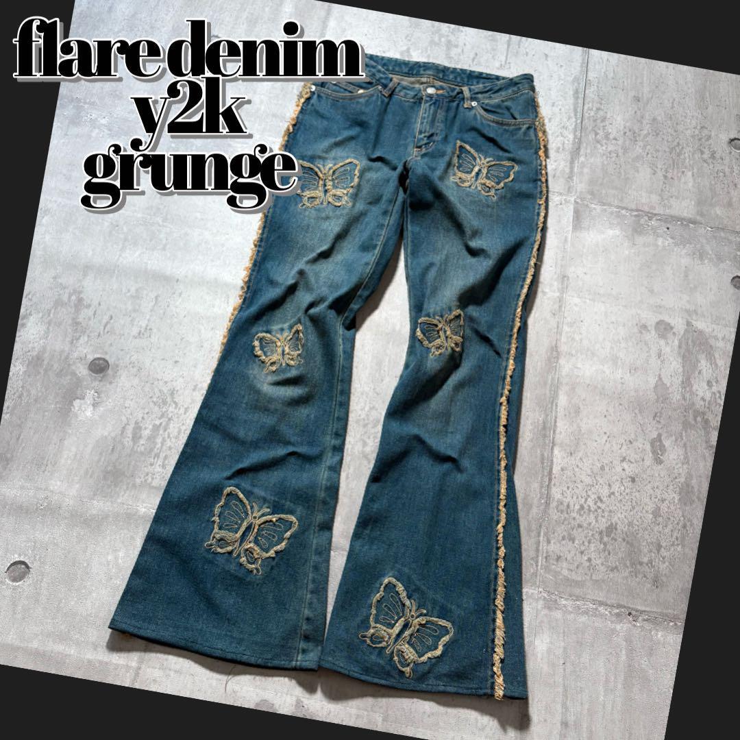 - y2k flare denim pants butterfly fringe