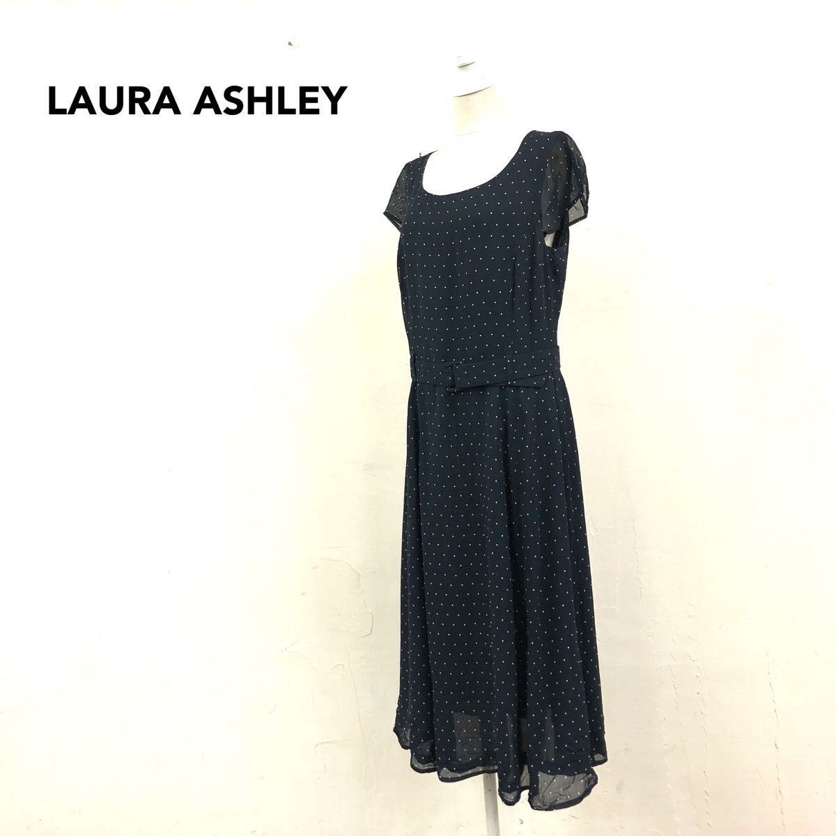 - 2K2879-N◆ LAURA ASHLEY ローラアシュレイ 半袖ワンピース ロング フレンチスリーブ ◆size8 ネイビー ドット ビスコース