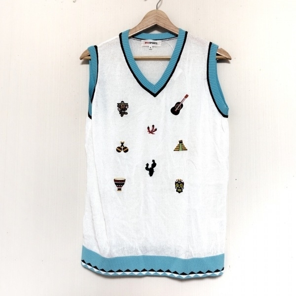 - ミエコウエサコ M・U・ SPORTS ベスト サイズ42 L - 白×ライトブルー×マルチ レディース イヌ/ギター/サボテン トップス
