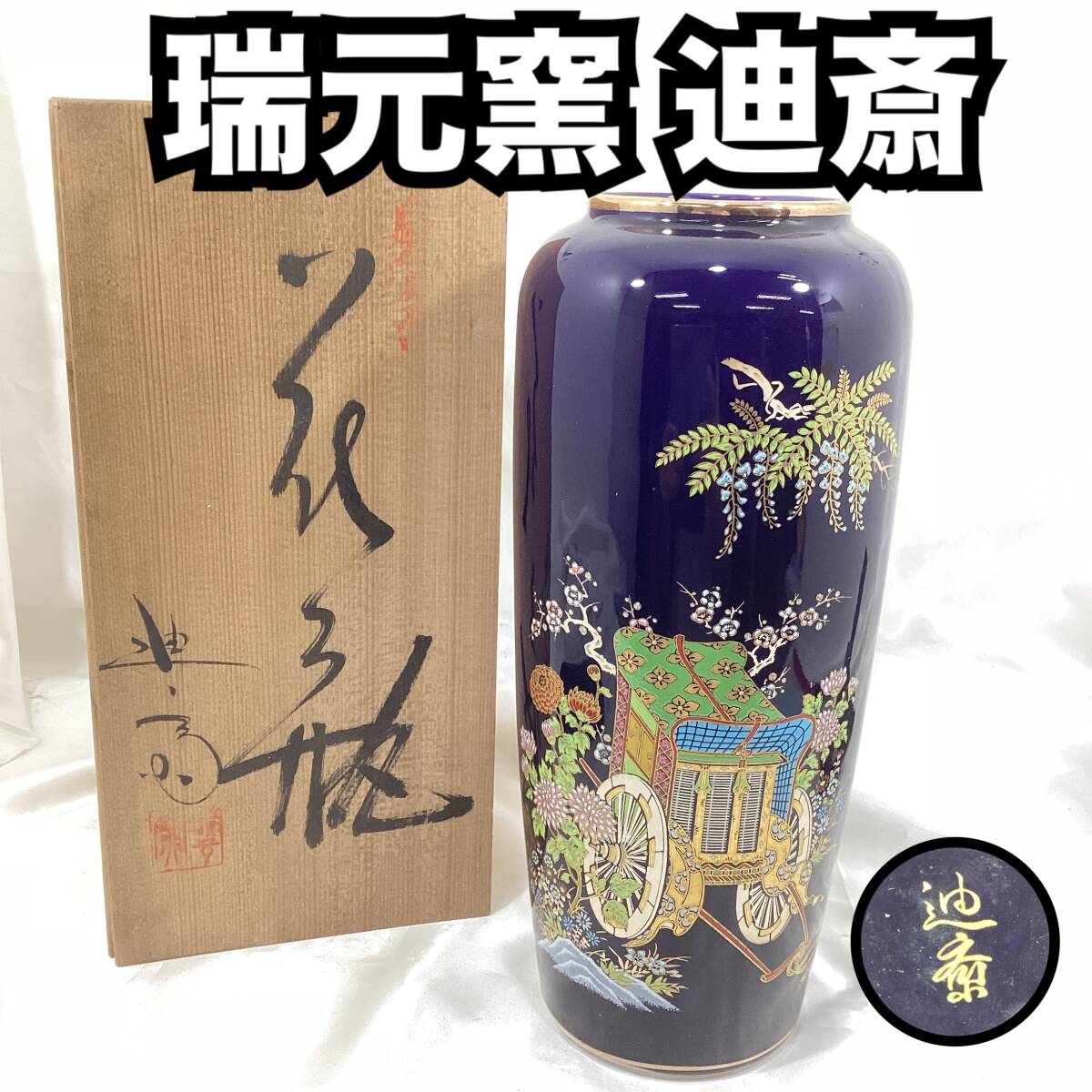 > 【未使用・保管品】瑞元窯 迪斎 花瓶 口径約7cm 高さ約28cm 花器 花入 花生け金彩 金縁 大辻 共箱 瑠璃色 濃紺 御所車 花草模様 【H1865】