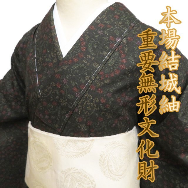 > 特選 160亀甲 重要無形文化財 本場結城紬 着物 未使用 袷 ラベル付き 華紋 赤墨色 多色 身丈162cm 裄68.5cm M きもの北條 A1276-1