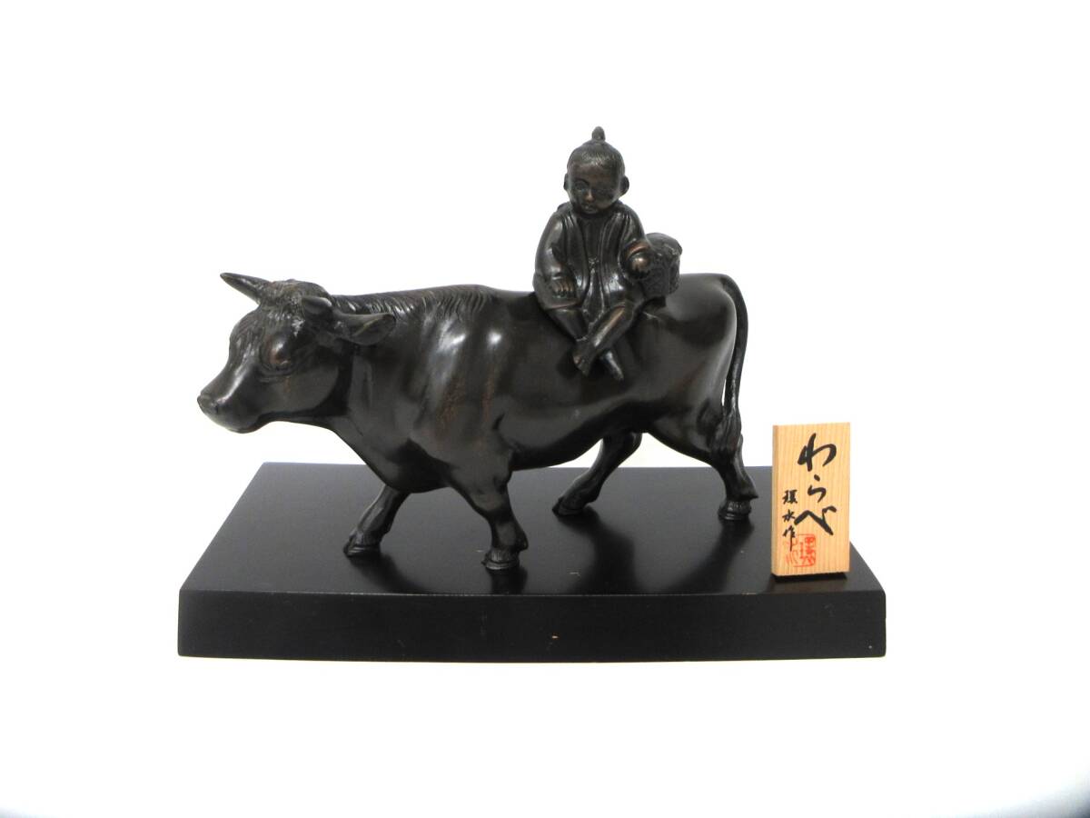 - 【9-194】環水作 わらべ 牛 丑 金属製 置物 台座付 動物 金属工芸