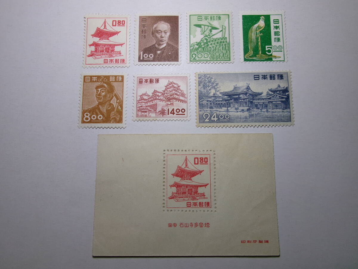 - 動植物国宝図案切手 すかしなし 多宝塔 姫路城 尾長 8枚セット 未使用 黒-A